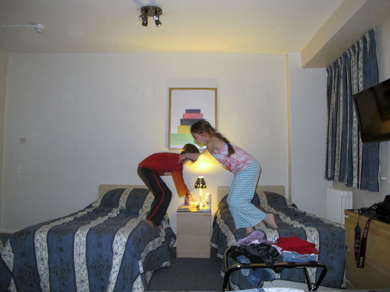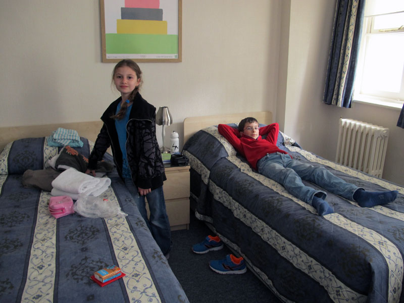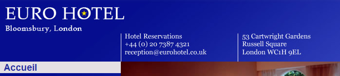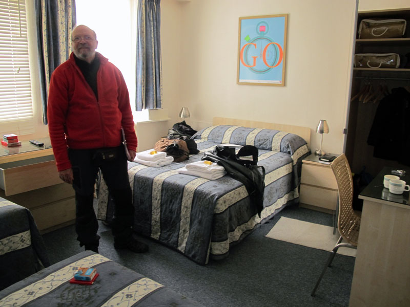 - Nous rejoignons à pied notre chambre (room 01 en semi sous-sol) à l’Euro Hotel, 53 Cartwright Gardens, London WC1H 9EL. Grande chambre avec un grand lit et 3 lits en 90, le pied total !
